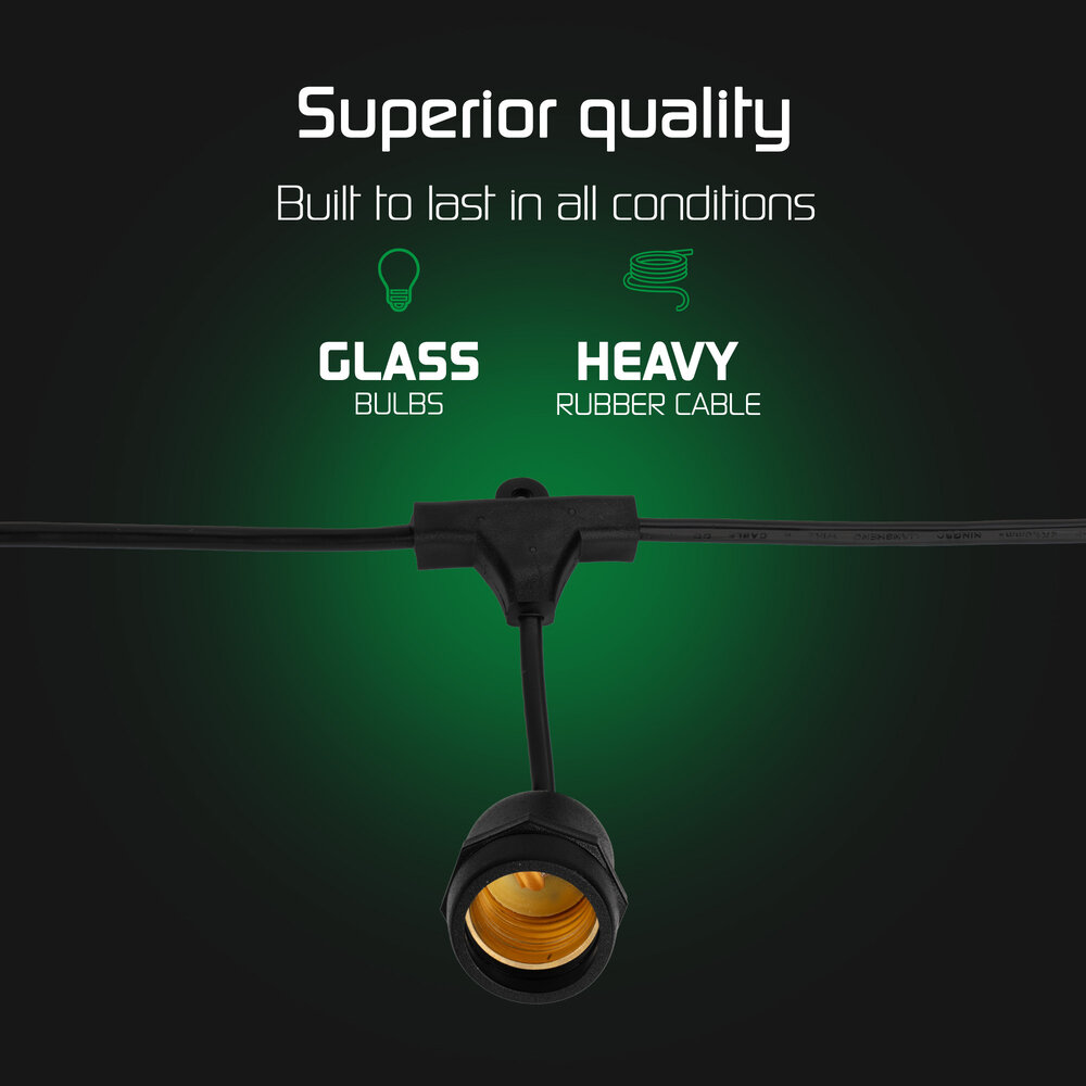 Op zoek naar dé perfecte manier om meer sfeer te creëren in de tuin, op het balkon of juist binnen in huis? Dan is deze professionele LED string light met E27 fittingen ideaal om wat extra sfeer toe te voegen. Het lichtsnoer heeft een IP-waarde van IP65 en is hierdoor straalwaterdicht en kan dus buiten worden gebruikt. Het hele jaar door genieten van deze gezellige sfeerverlichting buiten of juist binnen. Doordat je de E27 LED lampen naar eigen keuze erin kunt draaien, creëer je meteen jouw eigen thema! De E27 LED lampen die er in horen zijn niet inbegrepen, het wordt aangeraden deze bij te bestellen. Let op: Lightexpert kan niet garanderen dat elke E27 lamp correct in de fitting past om een waterdichte afsluiting te creëren. Sommige lampen bevatten te veel plastic in de aansluiting wat de waterdichte sealing onderbreekt. Controleer daarom goed of de gebruikte lamp geen gebrekkige aansluiting heeft.