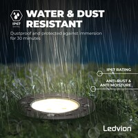 De LED grondspot wordt geleverd inclusief een Ledvion GU10 lamp. De Ledvion GU10 lamp heeft een lichtopbrengst van 345 lumen. Met een Wattageverbruik van maar 3W komt dit neer op 115 lumen per Watt.
