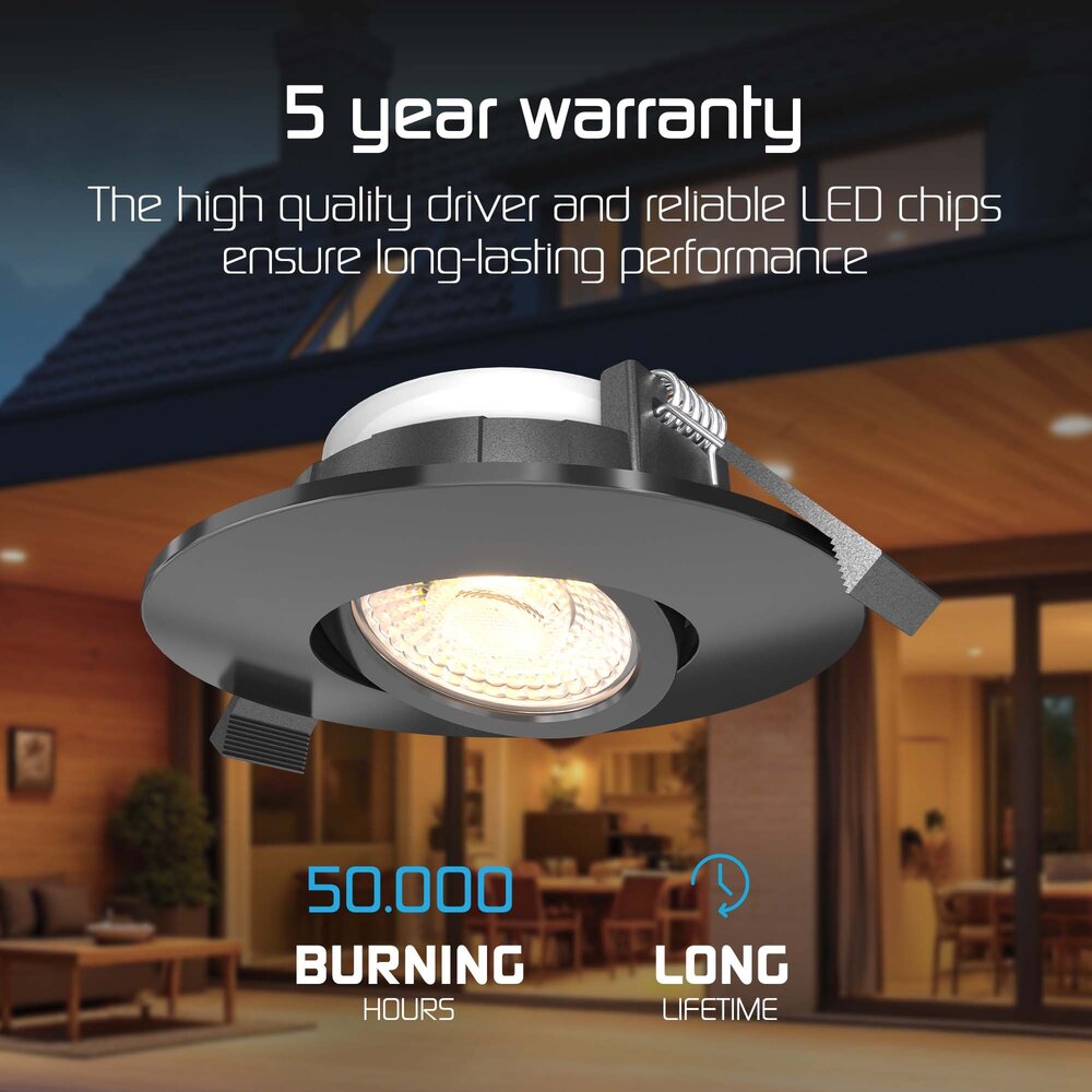 De LED downlights worden kant-en-klaar geleverd. Aan de hand van de meegeleverd lasklemmen kunnen de plafondspotjes snel en eenvoudig worden aangesloten op het 230V lichtnet. Doordat de LED inbouwspot is gemaakt van hoge kwaliteit heeft deze een zeer lange levensduur van 50.000 branduren en wordt er standaard 5 jaar garantie gegeven.