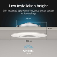 De downlight heeft een zaagmaat van Ø68-90 mm en is voorzien van een geïntegreerd LED systeem. Dit houdt in dat de lichtbron in de inbouwspot zit verwerkt. Daarnaast heeft deze witte downlight een zeer lage inbouwdiepte van 38 mm.